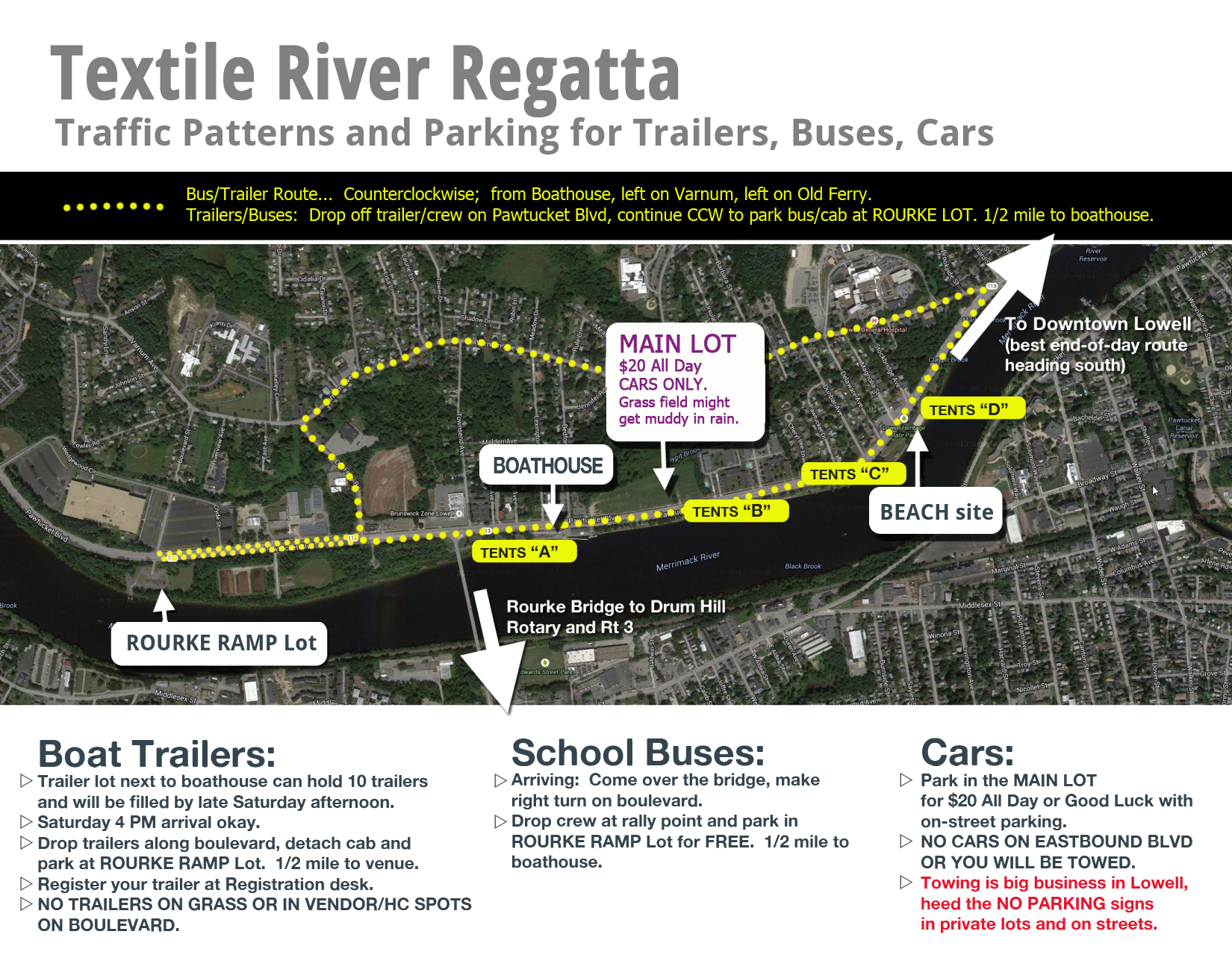 Your GPS has a major flaw. It correctly tells you that the route TO the regatta is to get off at the Drum Hill exit of Route 3 and take the Rourke Bridge directly to the boathouse, but fails to let you know that leaving the regatta late in the afternoon is far easier if you DON'T use the Rourke bridge. As with any event on this scale, the traffic going to the event is more evenly spread out than at the conclusion of the event when everyone wants to leave at the same time. There are many bridges crossing the Merrimack north and south of the Rourke, and they are all trailer-friendly.